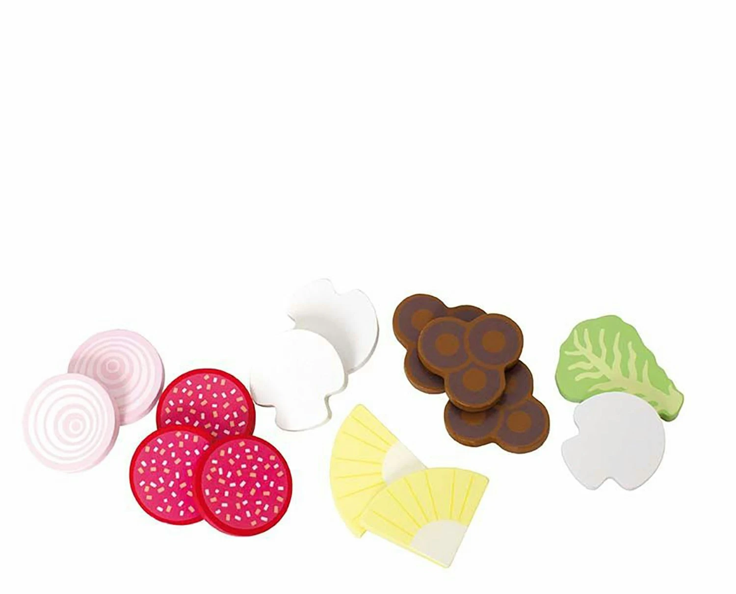 3 mushrooms, 3 salami slices, 3 onion rings, 3 lettuce leaves, 3 pineapple pieces, 3 olives