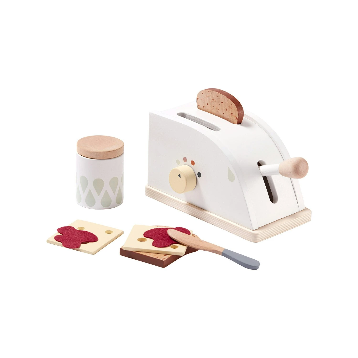 Keittiösarjaan kuuluu myös tämä ihastuttava leivänpaahdin setti. Settiin kuuluu pukki, kaksi leipäviipaletta, voiveitsi, kaksi juustoviipaletta, ja kaksi marmelaadi siivua.