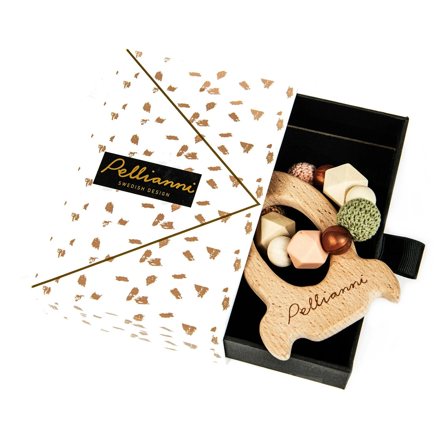 Purulelussa Pellianni-tuotemerkiltä on leikkisä muotoilu pienille lapsille täydellisesti sopivilla pehmeillä väreillä. Se valmistetaan käsittelemättömästä, ekologisesta puusta pureskeluystävällisillä palloilla silikonista ja kauniilla suojalla puuvillasta. EN71 turvallisuus standardit.